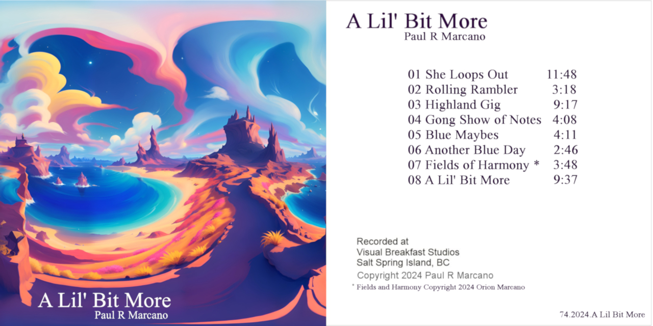 A little of my History... From an early age, probably 16 or 17 years old, I concluded that it takes almost as much energy to learn someone else's song and play it well as it does to create an original from scratch and play something self-expressive. With that mindset I set about the task of writing at least one song a day for awhile, the notion being that the art of 'doing' in itself is not only an exciting challenge but 'doing it a lot' could only result in better songs! Alas not many of those early works survived the test of time but a few pieces were recorded much later on a compilation, my 41st album in 2006 called "The Day before Yesterday 35 Years Ago". I think of these songs as "pre-stone age" because most were written before a transformative psychedelic period which lasted from 1972 to 1984 with after effects still lingering I suspect ;-). Each decade since I began recording has been pretty productive, I love creating new music. I remember that I was often motivated to create new music purely for the purpose of having some music perfectly tailored to listen to while pursuing my visual art in paintings and airbrush work. This was something I did right up until I fell into computers in 1984 with my first Atari drawing tablet! The '80s were particularly productive musically as I found new inspiration through electronic art and the evolving technology of home recording and music sampling along with easier access to symphonic sounds and synthesizer fx. It was quite an exciting leap from my mono, reel-to-reel sound-on-sound recordings of the 70's to the TEAC 144, 4 track cassette in the 80s, then to Optical Disk Recording in the 90s and now to pure digital desktop recording today. My influences were listening to artists like Alan Parson's and George Martin's work with the Beatles which taught me so much about recording production and layering... often falling into that 'spectre' of creating a wall of sound. However, I do have a preference for multi-layers of sound anyway and panning stereo into the mix for those who enjoy listening with headphones. In fact a similar layering and an attempt to reveal other dimensions shows in my visual artwork as well! I rarely am found unplugged but I still use the accoustic guitar to write and it is almost always included on a track or two in my final recordings. In 1981, a short-lived studio group was created called LightDreams because a friend of mine, known only as "Mushroom Dann" was impressed with an album I was producing at the time called "Islands in Space". He offered to help finance my first vinyl pressing which resulted in the only official record that I ever released in a limited edition of 1000 copies. The TEAC corporation was so impressed that I actually pressed an album from their then, cutting edge, multi-4 track TEAC 144, that they sent representatives to Canada from Japan to purchase a couple of cases of my records. It was really at the tail-end of the vinyl medium's peak before the current revitalized interest in vinyl. I still sell the occasional original copy of the first pressing to collectors from the few copies I have left. A recent second pressing has been licensed to and re-issued by Got Kinda Lost/ Guerssen Records and it's been very carefully reproduced with the added-value lyrics and liner notes! See Islands in Space Vinyl Re-Issue as well, the record companies decided to release a very rare limited first-issue of my double album 10001 Dreams Vinyl Issue, which is the 1982 follow-up to Islands in Space. Slowly but surely I am remastering and making my material available through this webpage for sampling and purchase and using all the wonderful channels and avenues offered by the Internet. I have also been producing music videos (some in 3D and some in the new 360 VR format) through my established YouTube Channel - please subscribe! CD Baby is my main commercial distributor for MP3 Digital Downloads as well as iTunes and others. These companies offer officially released digital downloads of my work and I add to them periodically, mostly single songs I feel particularly stand the test of time. The albums listed at the top of this page in the dropdown menu are an up-to-date archive of albums I have prioritized over time as 'best of' albums of my work. I use PayPal for online payments and will send you a link immediately to where you can download a copy (usually within 24 hrs), complete with album art sufficient to make a personal-use CD copy. You may request multiple albums in the catalogue via email and I will prioritize those and get you a link ASAP, feel free to inquire. Thank you for stopping by and for your interest in my music. Paul Ralph Marcano British Columbia Canada For multiple order pricing Contact Artist