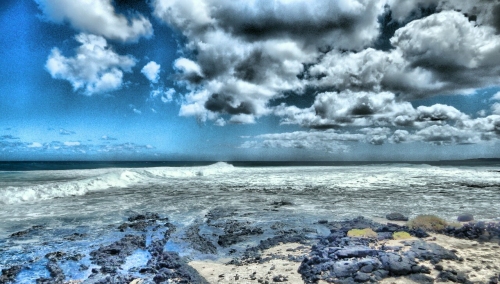 under a dome of cloud puffed blue glass skies